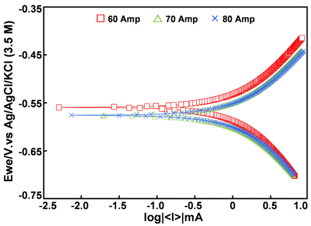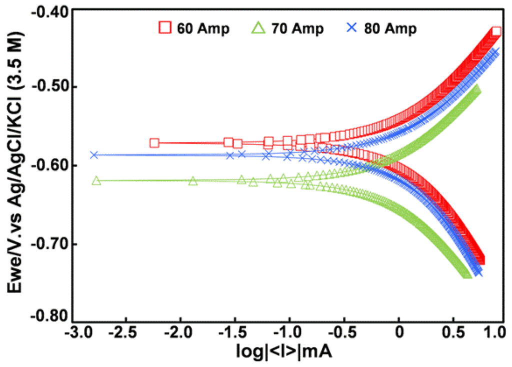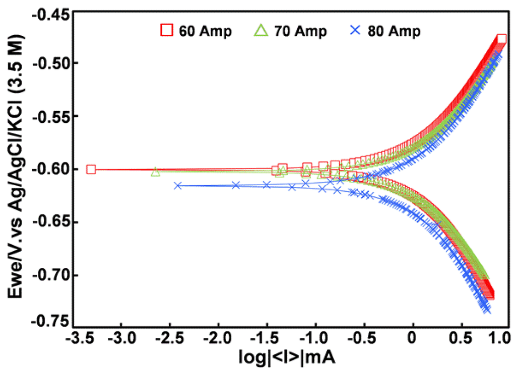 The crystallite size estimated from Scherrer’s equation (Table 3) showed that the increasing heat input had no significant effects on the size of the α-phase. On the other hand, the size of the γ-phase increased when the welding current was raised. The XRD results indicated that the heating from the welding current could change the metallurgical and crystallite properties of the γ-phase which have an effect on the mechanical and corrosive properties [24]. A possible explanation was that the austenite specimens exhibited properties different than those with ferrite phase. So, the properties of the specimens at 70 and 80 A could be better than the specimens of 60 A. However, the high current makes the strong heating transfer which caused the defects from thermal shock in the structure. For these reasons, the mechanical and corrosive properties of specimens subjected to a current of 80 A became lower than that of 70 A. Accordingly, the results showed the correlation of the mechanical and corrosive properties, and, therefore, it could be concluded that the welding current at 70 A was suitable for preparing A106 welded pipe.