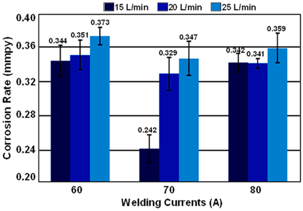 Corrosion rate of the pieces that connect with the heat input of welding at 0.91, 0.95, and 1.04 kJ/mm, at test flow rates of 15, 20 and 25 L/min.
