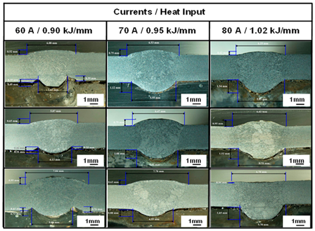 From the corrosion rate analysis (Figure 9), the welded specimen with a flow rate of 15 L/min exhibited a lower corrosion rate than those of 20 and 25 L/min. On the other hand, the welded specimen with a welding heat input of 0.95 kJ/mm showed a lower corrosion than those of 1.04 and 0.91 kJ/mm. Based on these results, three hypotheses could be considered concerning the cause of the discrepancies between the corrosion rates of the welded specimens: (1) the defective welding of convexity (root reinforcement) was too high; (2) the influence of the water flow crash caused the unembossment of welding (root reinforcement); and (3) heat input caused the structural changes of the welding metallurgy. Therefore, researchers had taken microstructure images of the welding piece as shown in Figure 10.