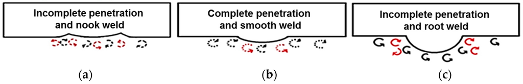Figure 11a shows the schematic representation of the welded pipe specimens. The specimens with a welding current of 60 A revealed the incomplete joint because the welding current was relatively low. It might be noted that the Cl− from NaCl contacting the internal pipe caused the corrosive conditions. If some Cl− remained and eventually accumulated where the specimens were not fully joined, pitting mode corrosion could occur. Moreover, the potential in the pipe was then increased. As a consequence, this corrosive environment will enhance the reactions as shown in the Equations (2)–(6), which led to the severe corrosion.