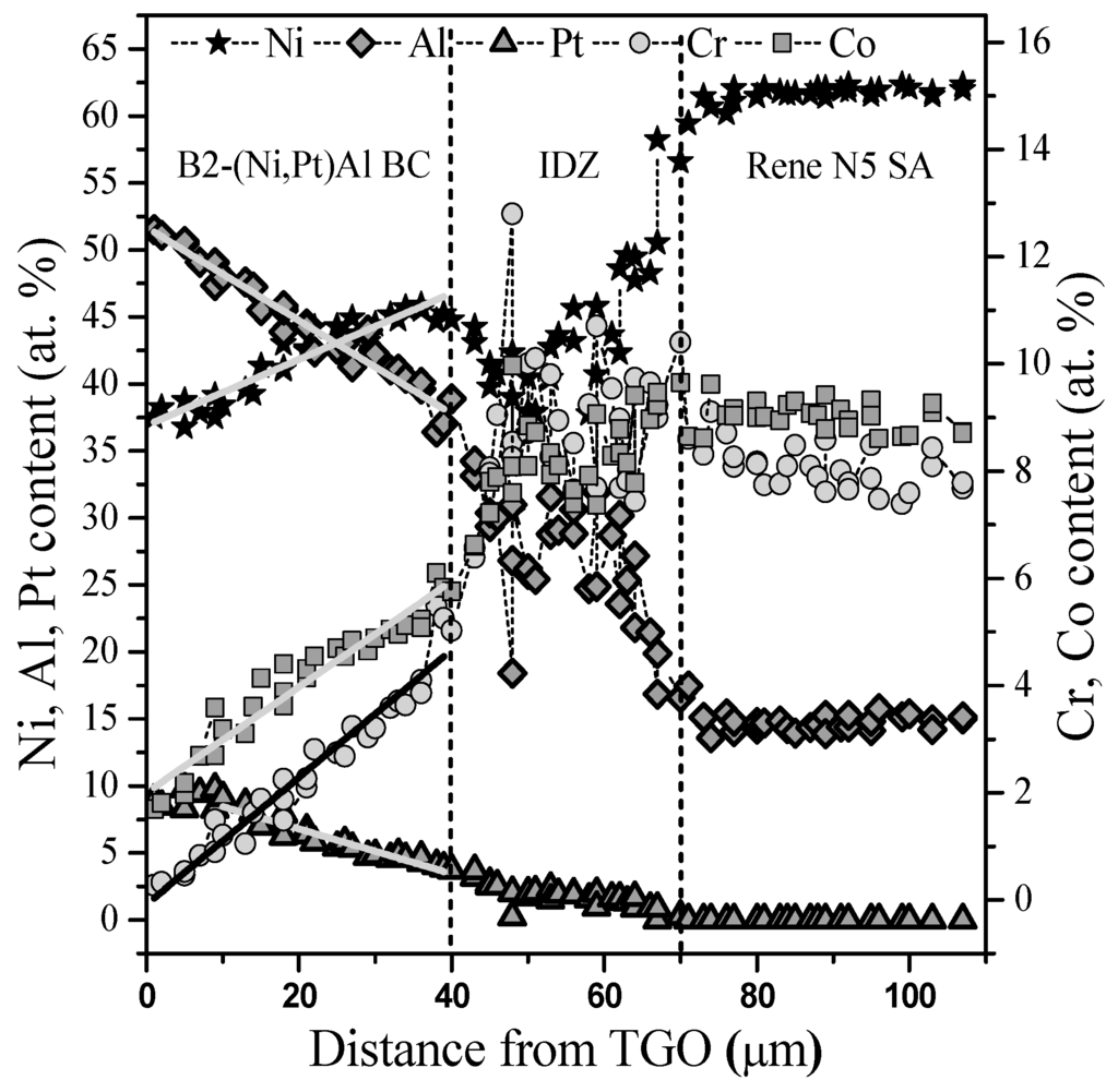 Figure 1 shows the composition of Ni, Al, Pt, Cr and Co along the cross section of the as-received B2-(Ni,Pt)Al coatings used for the NO and SFO experiments, as a function of the distance from the surface covering the bond coat, the Interdiffusion Zone (IDZ) and the last 40 µm belongs to the superalloy. The major constituent elements in the BC (Al, Ni and Pt) varied almost linearly from 51.5, 37.5 and 9.0 at. % to 34.2, 44.2 and 3.7 at. %, respectively. A slight increase in Pt is observed on the first 13 µm of the BC and later decreased to 0 at the IDZ/SA interface. Co and Cr are also measured in the BC and vary from 1 and 0.3 at. % to 7 and 7 at. %, respectively. The IDZ showed heterogeneous concentrations of Ni, Al, Pt, Co and Cr distributed in γ and γ′ phases, as well as µ precipitates [7,28]. Minor content elements, mainly allocated in the IDZ such as W, Re, Ta, Mo (not shown in Figure 1) are also present even in the BC but are not considered in the analysis. Finally, the chemical content of the SA is in agreement with that previously reported in the literature [29] and showed a constant behavior along the measured section.