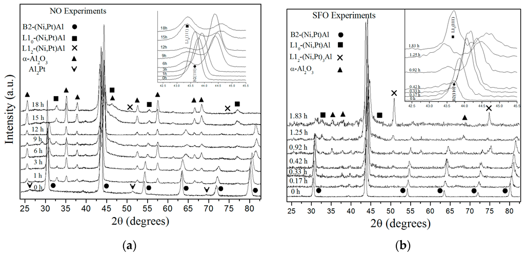 where I is the relative intensity of the peaks of the B2 phase. The subscripts correspond to the contributions of the superlattice (SL) and fundamental (F) peaks of the thermally treated (obs) and “reference” (ref) samples. The “as-received” sample for the NO and SFO experiments are used as the reference condition, since no crystallographic information JCPDS (Joint Committee on Powder Diffraction Standards) files are available for the B2-(Ni,Pt)Al phase. The determination of S is performed for those XRD patterns that allowed a reliable measurement of the superlattice/fundamental peaks ratio. This corresponds to the experiments from 0 to 1.25 h for SFO and from 0 to 12 h for NO oxidation experiments. After those times, superlattice peaks are not observed.
