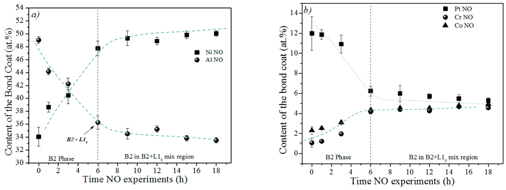 Another non-expected increment of Al is observed in the sample exposed to 12 h of NO due to the presence of the Al2Pt phase. The characterization of all the specimens in the as-received conditions allowed the identification of the aforementioned phase in the samples that were later exposed to 0, 3 and 12 h. In this case, the Al2Pt phase dissolves, which increases the Al content of the coating.