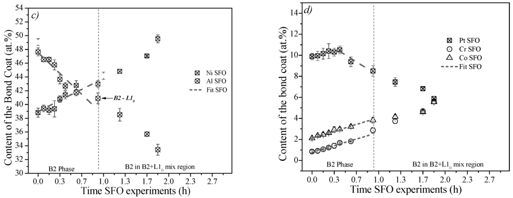 The NO and SFO experiments represent different oxidation kinetics. Nevertheless, the boundaries for the B2 → L10 martensitic transformation in the NO experiments are 36.3 at. % Al, 6.2 at. % Pt, 4.2 at. % Cr, 4.4 at. % Co and 47.7 at. % Ni, and those for the SFO experiments are 40.9 at. % Al, 8.5 at. % Pt, 2.9 at. % Cr, 3.8 at. % Co and 42.9 at. % of Ni.