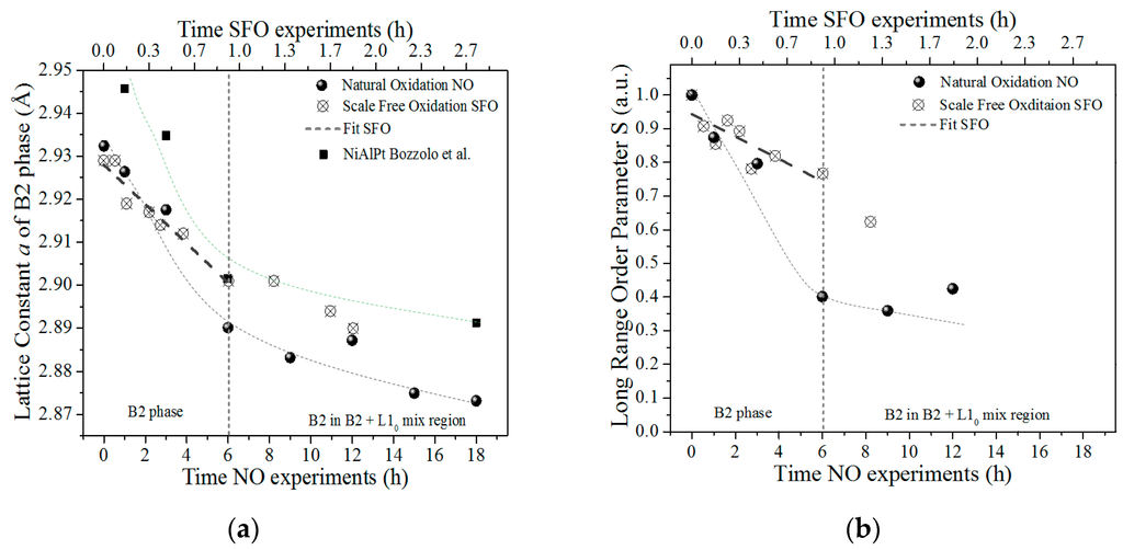 Figure 5a,b show the lattice constant a and long-range order parameter S of the B2-(Ni,Pt)Al phase obtained from the analysis of the XRD patterns for the NO and SFO experiments as a function of the oxidation time. The lattice constant of the as-received sample is 2.932 Å, which is in turn 1.6% higher than that expected for the stoichiometric binary NiAl alloy. This increase is due to Pt-additions (12 at. %) and is in agreement with results reported by Chen et al. [30]. In general, it is found that the lattice constant decreases as a function of the thermal exposure time and follows similar trends for NO and SFO experiments during the first stages of the oxidation.