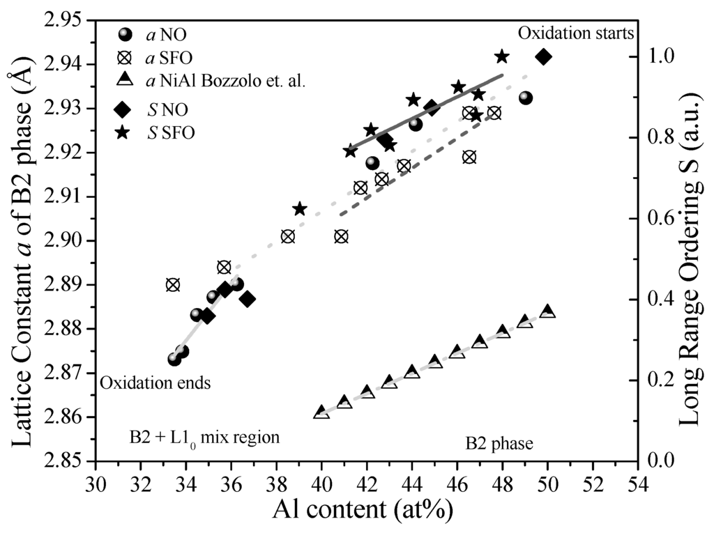 Given that the oxidation time is not a physically meaningful independent variable, nor does it allow direct comparison of natural and scale free oxidation results, the lattice constant and long-range ordering parameter are plotted in Figure 6 versus the corresponding variable, as a function of the Al content for NO and SFO experiments, since it is the most representative contributor to the crystal structure properties and ordering. The oxidation process is shown by the expressions “Oxidation starts” for 0 h and “Oxidation ends” for 18 h and 1.83 h of NO and SFO, respectively. Data from the literature for the binary NiAl system is also represented in Figure 6 for comparative purposes. The values reported by Bozzolo et al. [36] correspond to first principles calculations performed in B2-NiAl and applying Ni antisite defects for compositions out of the stoichiometry, in order to maintain the B2 crystal structure.