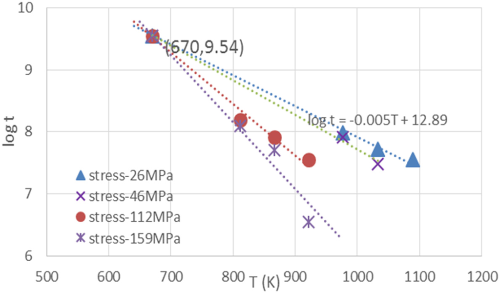 The Manson–Haferd parameter was extracted through plotting creep-rupture data [26] as log (time) vs. temperature. According to the Manson-Haferd parameter, all logt–T lines at different stresses should converge to one point, where the temperature is regarded as the Creep Initiation Temperature, below which no creep occurs. We determine this temperature as 40% of the melting temperature. This corresponds to the reference temperature. In this case the reference temperature is found to be Tref = 670 K. At this temperature, the rupture times at different stresses were found. According to Manson-Haferd parameter, these rupture times should be the same. However, because the accuracy of experiments is influenced by many factors, such as facilities and environment, the points (rupture time, reference temperature) at different stresses cannot be collected into one point. Therefore, the average of these rupture times is employed to define the rupture time at the point of convergence, and the point of convergence is identified to be (670, 9.54) (shown in Figure 2). The Manson-Haferd parameter is stress dependent, and the values are obtained as the inverse of the slope from the fitted lines. Then, the relationship between Manson-Haferd parameter and stress can be extracted from Figure 2, and Equation (21) is given through curve-fitting: