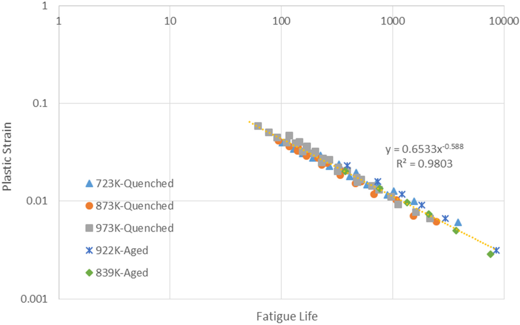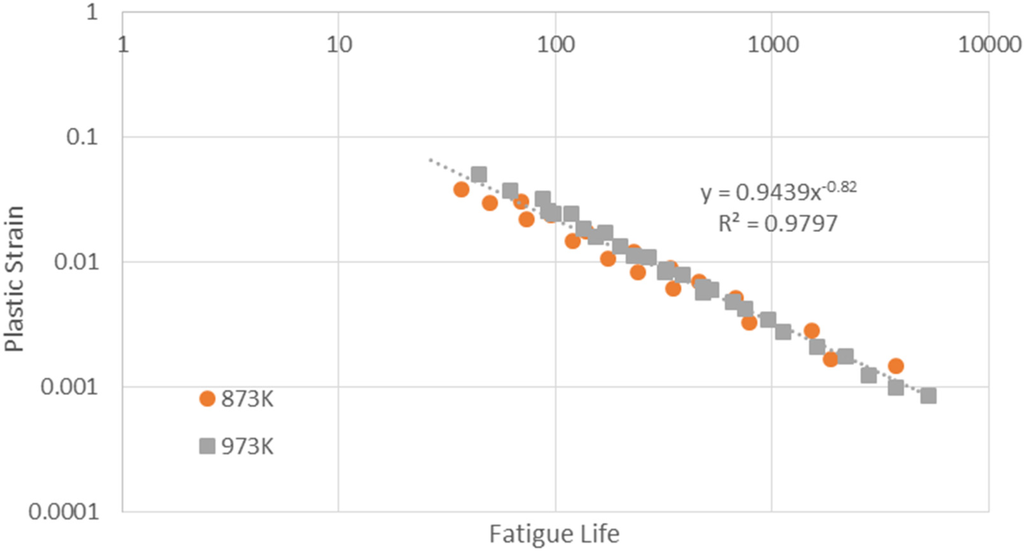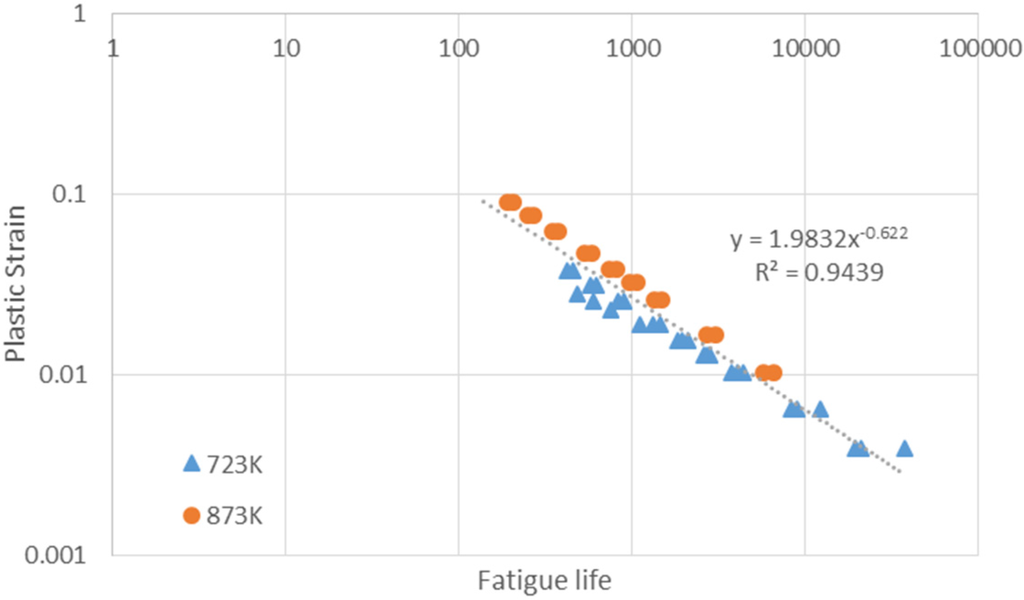 Figure 9 and Figure 10 show that the creep-fatigue data below 873 K and above 873 K can be collapsed into power-law curves of with the quality of fit as R2 = 0.9439 and with the quality of fit as R2 = 0.9783 respectively. The errors between fatigue life from experiments and creep-fatigue equation for these two temperature regimes are 0.814 and 0.294. This transformation has verified the creep-fatigue-equation-based temperature modified Coffin-Manson equation.