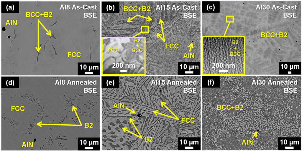 Representative backscattered electron (BSE) images of the Al8, Al15, and Al30 high-entropy alloys (HEAs) in as-cast (a–c) and annealed (d–f) conditions, respectively. The inset images in (b,c) are higher resolution scanning-transmission electron microscopy-high angle annular darkfield (STEM-HAADF) images of the Al15 and Al30 HEAs. The as-cast BSE images are taken from [7,15].