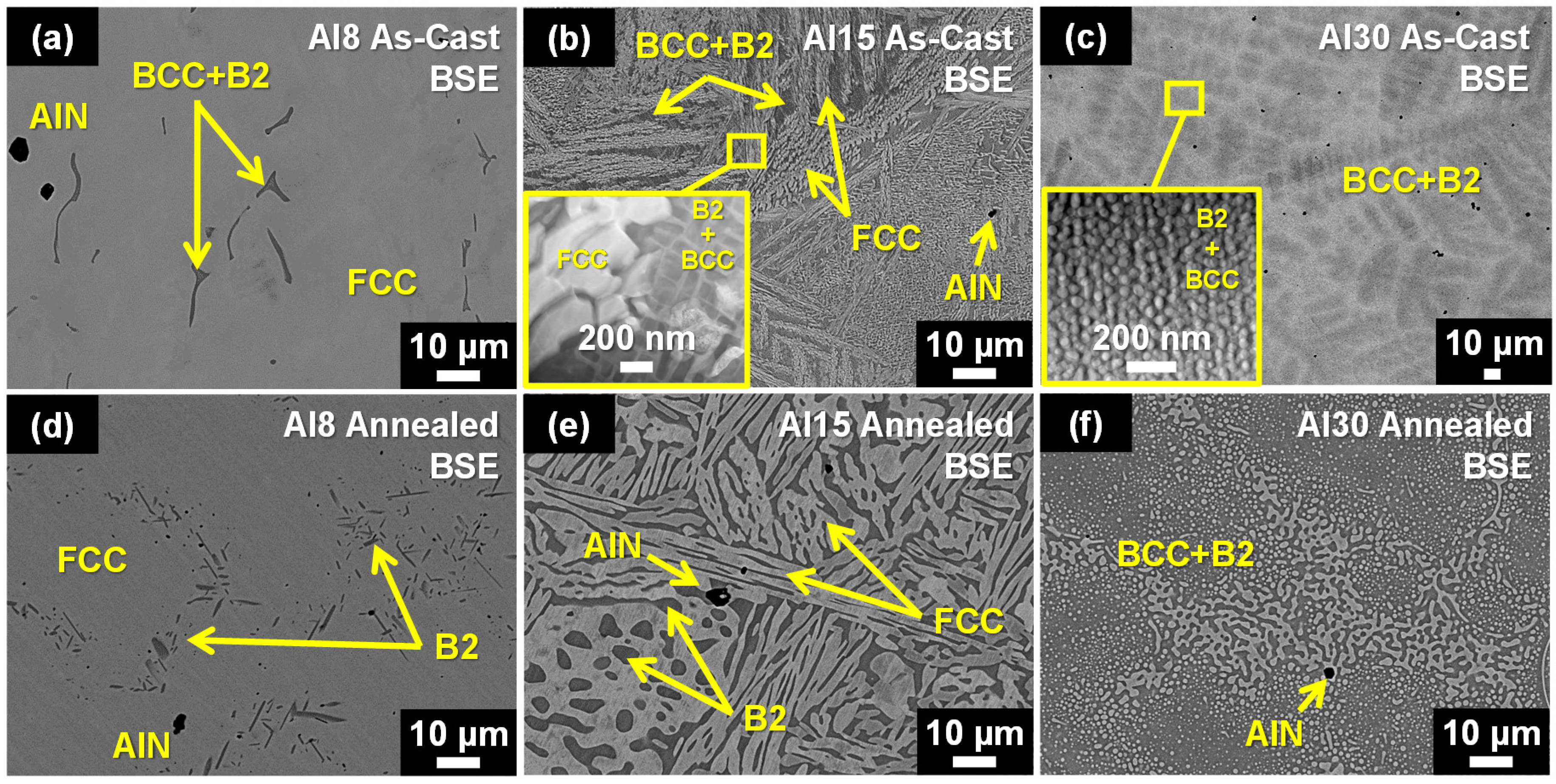 - The as-cast Al8 and Al15 HEAs consisted of a combination of FCC, BCC, and B2 solid solution phases. Annealing at 1050 °C for 120 h resulted in significant coarsening of the FCC and B2 phases and dissolution of the primary BCC phase. The as-cast Al30 HEA consisted of a uniform distribution of sub-micron sized BCC precipitates with spherical morphologies dispersed in a B2 matrix. Annealing of the Al30 HEA also caused substantial microstructural coarsening and the formation of additional nano-scale B2 precipitates inside the BCC phase. In all cases, annealing increased the phase fraction of the B2 phase at the expense of the FCC and/or BCC phases.
