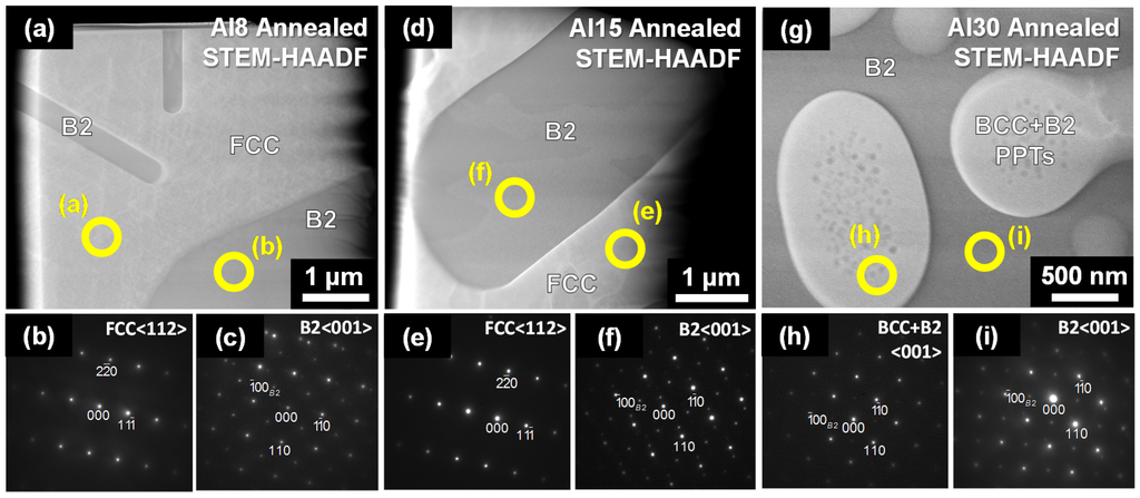 STEM-HAADF images and corresponding selected area diffraction patterns (SADPs) for the annealed Al8 (a–c); Al15 (d–f); and Al30 (g–i) HEAs. The open circles indicate the locations from which the SADPs were collected.