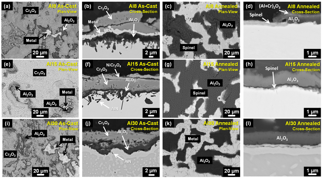 Figure 3i,j show plan-view and cross-sectional BSE images for the as-cast Al30 HEA after 50 h of oxidation [7,15]. An external Cr2O3 scale formed above an underlying, continuous scale of Al2O3. In this particular case, no spinel was observed and very few AlN precipitates were present, Figure 3j. Oxidation of the annealed Al30 HEA resulted in the sole formation of Al2O3, Figure 3k,l. In contrast to the Al8 and Al15 HEAs, no internal oxidation was observed.