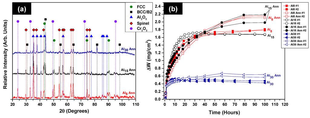 To verify the post oxidation phases in the annealed/oxidized HEAs, XRD analysis was done in plan-view on bulk specimens. Figure 4a shows representative XRD patterns for the annealed HEAs after 50 h of oxidation. Each alloy contained peaks associated with a combination of Al2O3, spinel (NiCr2O4), and FCC, BCC, and/or B2 type phases. Additionally, some peaks associated with Cr2O3 were present and are likely associated with the Cr-rich regions observed in some regions of the Al2O3 scales.