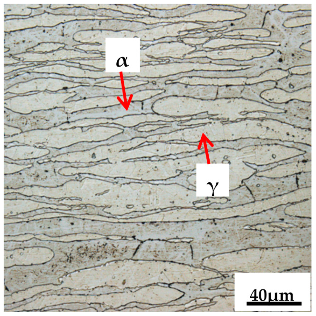 - Yang, Y.H.; Yan, B. The microstructure and flow behavior of 2205 duplex stainless steels during high temperature compression deformation. Mater. Sci. Eng. A 2013, 579, 194–201. [Google Scholar] [CrossRef]