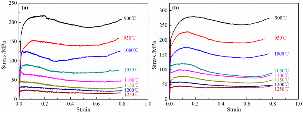 The flow stress-strain curves of 2707 HDSS in the temperature range of 900–1250 °C and strain rate range of 0.01–10 s−1 are shown in Figure 2. Obviously, the flow stress was strongly dependent on both the deformation temperature and strain rate. Meanwhile, the peak stress increased with increasing strain rate and decreasing temperature. The results revealed that all the curves showed similar characteristics of work hardening at the early stage of deformation. The initial increment of stress as a result of work hardening is attributed to an increase of dislocation density [].