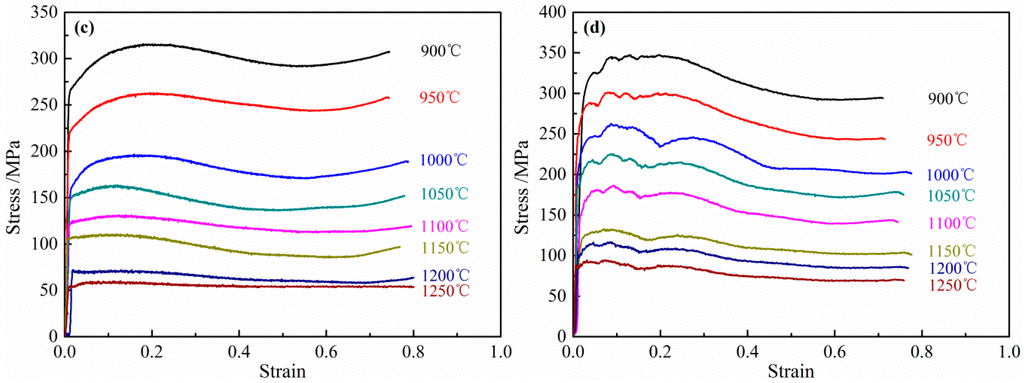 - The flow stress was especially sensitive to deformation temperature and strain rate as it increased with increasing strain rate and decreasing deformation temperature. When the temperature was higher than 1100 °C and strain rate was less than 1 s−1, the true stress-strain curves exhibited DRV characteristics without peak stress. Flow curves with peak stress could be observed at lower temperatures, which may be attributed to DRX or flow instability.