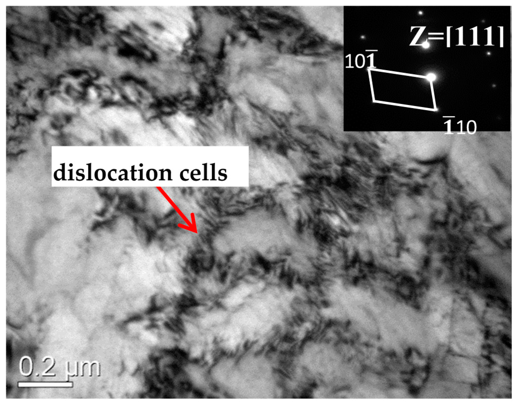 The microstructures of 2707 HDSS under different deformation temperatures with strain of 0.8 and strain rate of 0.01 s−1 are shown in Figure 3. Figure 3a,b show that a large number of precipitates with the streamline shape appeared in ferrite and distributed along the deformation direction at 950 and 1050 °C. In order to identify the precipitates, SEM and TEM observation were performed as shown in Figure 4 and Figure 5. SEM image shows that the ferrite was decomposed into one phase with coral-like structure and another phase with irregular island structure. And EDS analysis shows that the former phase was σ phase containing high content of Cr and Mo and the latter phase was secondary austenite with high Ni content, as reported by Paulraj et al. []. TEM image and selected area electron diffraction (SAED) pattern indicate σ phase with a tetragonal crystal structure presenting round type. The results of SEM and TEM analysis proved the occurrence of α→γ2 + σ. It is reported that precipitates could restrain processing of discontinuous DRX because of precipitates pinning grain boundaries [,,,]. Therefore, it is difficult for discontinuous DRX to occur under these conditions. TEM image of the dislocation cells in ferrite is shown in Figure 6. The dislocation cells formed by tangled dislocations in ferrite indicate the occurrence of DRV in ferrite [].