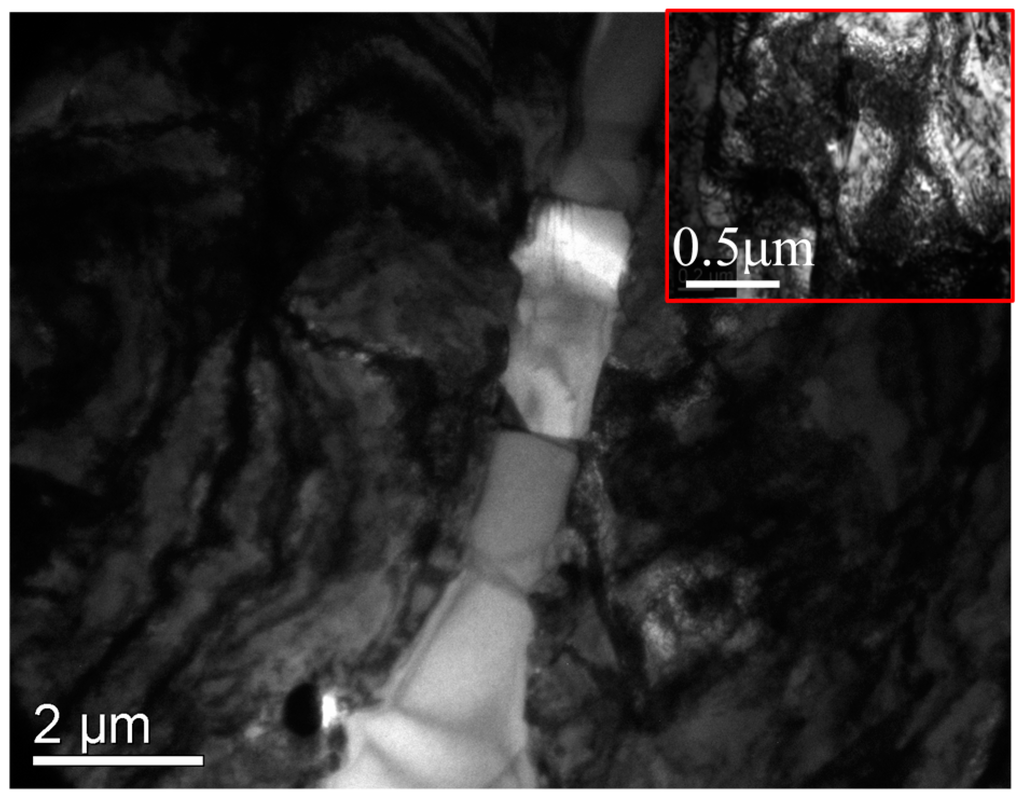 Besides, the existence of DRX grains in 2707 HDSS deformed at 1050 °C and 10 s−1 observed by TEM is shown in Figure 9. The new austenite grains were surrounded by dislocations, and the high dislocation density meant more significant plastic deformation characteristic []. However, discontinuous DRX phenomenon could not be observed, as shown in Figure 3b. From these, it could be concluded that the driving force of discontinuous DRX was the reduction of storage energy [], and high strain rate could promote discontinuous DRX of austenite in 2707 HDSS.