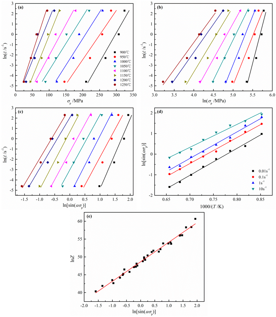 Relationships among flow strain rate and temperature for 2707 HDSS under hot compression: (a) ln − σ; (b) ln − lnσ; (c) ln − ln[sinh(ασ)]; (d) ln[sinh(ασ)] − 1000/T; (e) lnZ − ln[sinh(ασ)].