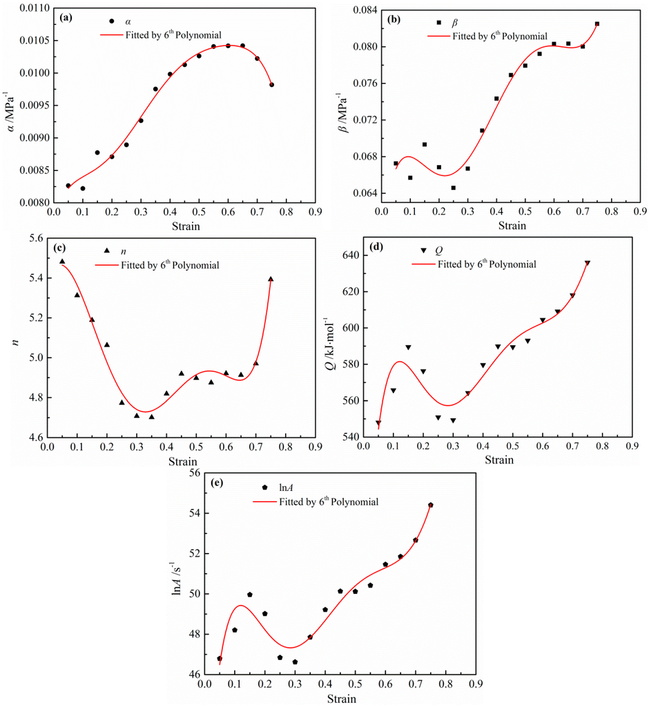 It is considered that the effect of strain on flow stress at elevated temperature is insignificant and thus would usually be ignored in Equation (1) []. However, it could be found that the strain also has an important effect on the flow stress besides strain rate and deformation temperature as shown in Figure 2. Meanwhile, the effect of the strain on the material constants (i.e., α, β, n, Q, and lnA) is significant in the entire strain range as shown in Figure 11. Therefore, compensation of strain should be taken into account in order to derive constitutive modeling to predict the flow stress more precisely. The effect of strain was represented by presuming that different material constants were polynomial functions of strain [,,]. In the present study, the values of material constants of the constitutive relationships were calculated under various true strains within the range of 0.05–0.75 and the intervals of 0.05. The order of the fitted polynomial was varied from two to eight for selecting the best fitted model. As shown in Equation (9), a sixth order polynomial was found to represent the influence of strain on material constants with a good correlation and generalization, and the fitted curves are shown in Figure 11. A higher order (i.e. >6) polynomial would over-fit, thus losing the ability of true representation and generalization. The polynomial fit results of α, β, n, Q, and lnA of 2707 HDSS are provided in Table 2.