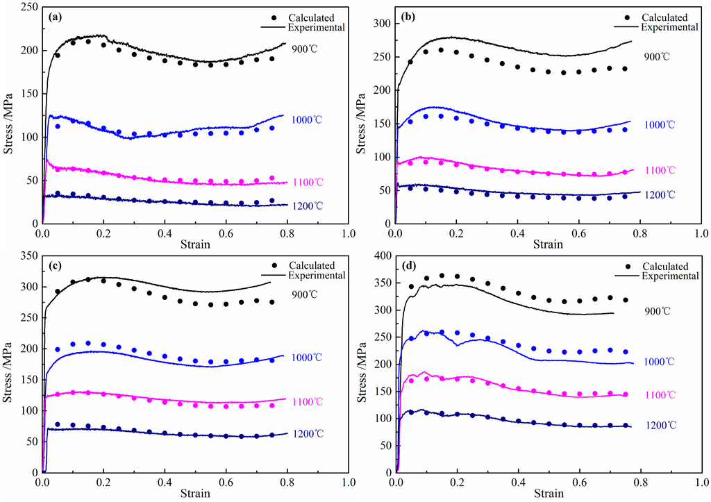 Comparison between calculated and experimental flow stress curves at strain rates: (a) 0.01 s−1; (b) 0.1 s−1; (c) 1 s−1; (d) 10 s−1.