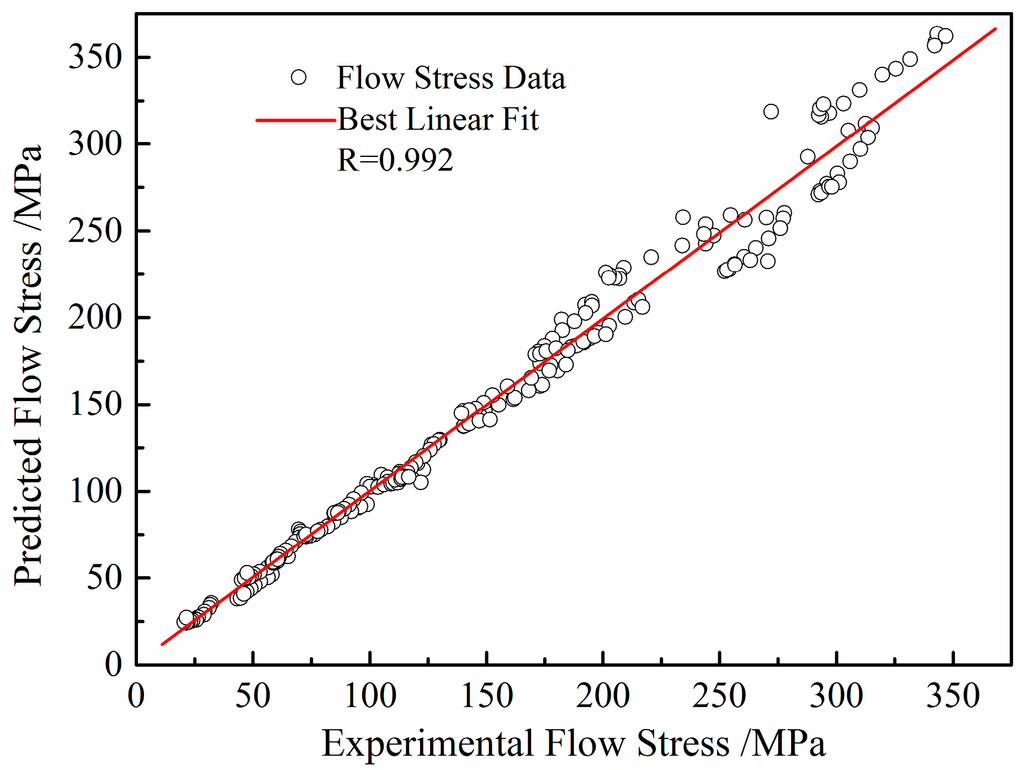 High temperature flow behavior, as the macro-reflection of the mechanisms of microscopic deformation and microstructure evolution, is often represented by making use of constitutive modeling []. In recent years, various analytical, phenomenological, and empirical models have been developed to predict the constitutive behavior of a wide range of metals and alloys [,,,]. Among these models, the hyperbolic sine law in the Arrhenius equation has been widely applied for engineering applications. However, it lacks suitability for materials having obvious dynamic softening during hot deformation, since the influence of strain is not included. Accordingly, the researchers have put their efforts on the strain compensated Arrhenius model [,], and the prediction accuracy is greatly enhanced.