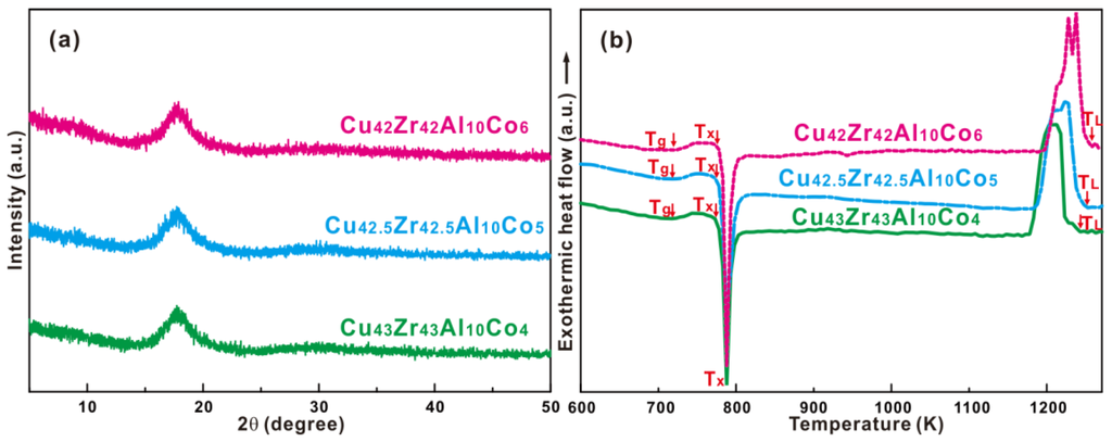 (a) XRD patterns of the (Cu0.5Zr0.5)90−xAl10Cox (x = 4, 5, and 6 at. %) BMGs with a diameter of 2 mm; (b) DSC curves of the as-cast BMGs at a heating rate of 20 K/min.