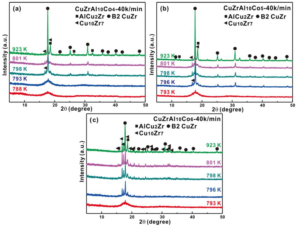 XRD patterns of the as-annealed (Cu0.5Zr0.5)90−xAl10Cox (x = (a) 4; (b) 5; and (c) 6 at. %) samples at a heating rate of 40 K/min at temperatures as indexed in the present figures.