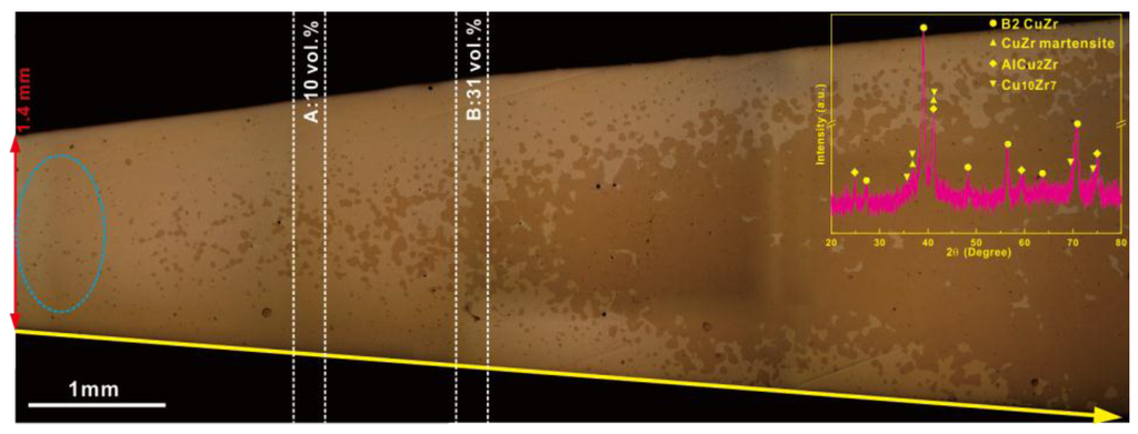 OM image of the as-quenched (Cu0.5Zr0.5)84Al10Co6 BMG composites with a wedge-shape.