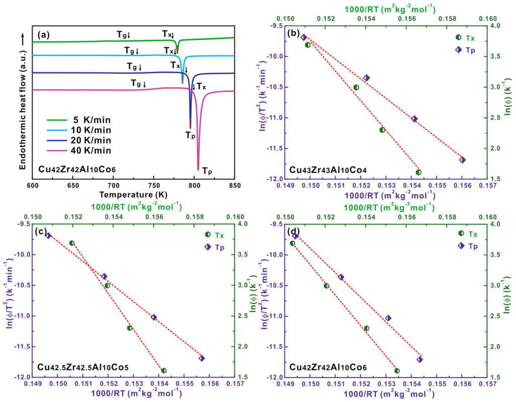 Since kinetic effects can also play an important role in the formation of BMGs during the solidification of metallic glass-forming liquids [47], the crystallization kinetics of the B2 CuZr phase in Cu-Zr-Al-Co BMGs were investigated. It has been shown that the apparent activation energies of crystallization were calculated based on the dependences of Tx and Tp on heating rates according to the Ozawa method and Kissinger equation, respectively [56,57,58]: