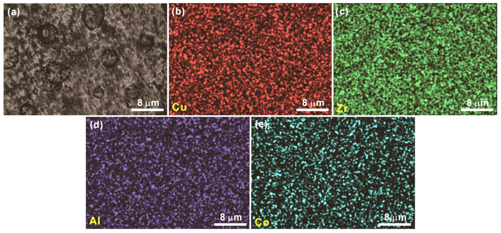 (a) Amplificatory SEM images of the as-annealed (Cu0.5Zr0.5)84Al10Co6 samples at a heating rate of 40 K/min at 793 K, and the EDX results for the elements (b) Cu, (c) Zr, (d) Al, and (e) Co in the present samples.