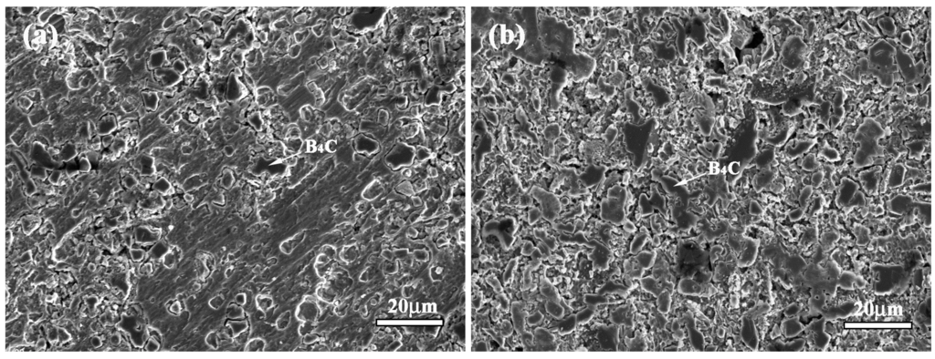 B4C/Al 5083 composites with 10–30 wt % B4C contents were successfully fabricated using the hot-press sintering method under Argon atmosphere. As shown in Figure 1, the B4C/Al 5083 composite exhibits a relatively higher compactness. Only a few pores can be observed in the local region, which reflects the advantage of hot-press sintering and builds the base of high wear resistance.