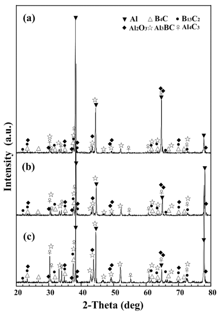 Figure 4 show the phase identification of the B4C/Al 5083 composite with 10–30 wt % B4C contents. As indicated, besides Al and B4C, the B4C/Al 5083 composite consists of B13C2, Al3BC, Al4C3 and Al2O3, as shown in Figure 4a–c. The phase of Al2O3 results from the pretreatment of Al 5083 at 250 °C. Part of the Al 5083 reacts with oxygen, which corresponds to the element of O in Figure 3c. Halverson and co-workers [] declared the reaction behavior between B4C and the Al matrix in detail. In the hot-press sintering process, B4C reacted with Al 5083, forming the B13C2, Al3BC and Al4C3. The elements that exist in the products are similar to the EDS results in Figure 3d. These interfacial reactions are considered as the driving force to enhance the wettability of B4C in the Al 5083 matrix.