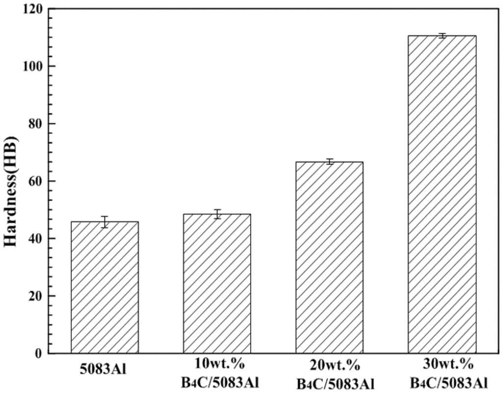 Microhardness values of the pure Al 5083 matrix and 10–30 wt % B4C/Al 5083 composite are shown in Figure 5. Al 5083 matrix owns the minimal hardness value (45.7 HB). The microhardness values of 10–30 wt % B4C/Al 5083 composites are 48.5 HB, 66.7 HB and 110.5 HB, respectively. When the B4C content increases from 10 wt % to 30 wt %, the hardness value increases gradually, which can be attributed to the increase of the ceramic content.