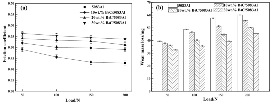 (a) Friction coefficient and (b) wear mass loss of Al matrix and B4C/Al 5083 composite under different applied loads.