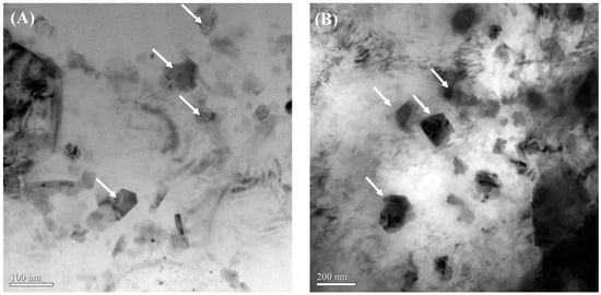 Figure 7A,B shows the microstructure of the peak-aged Al6061-Y2O3 and Al6061-TiC composites, respectively. There was almost no precipitation observed in these two alloy samples. In the Al6061-Y2O3 sample, a number of dark particles were observed (see the arrows of Figure 7A), and they contain a high level of Al, Mg, Si, Y, and O elements measured by EDS. In early work, it has been reported that Y2O3 particles in the Al6061 alloy can act as nucleation sites to facilitate the formation of the complex Al–Si–Y–O oxide particle [12]. The aging process could further promote and accelerate the diffusion of Mg atoms; therefore, a high concentration of Mg was found in the complex oxides. In the case of the Al6061-TiC sample, TiC particles containing a small amount of Al, Mg, and Si elements were observed in the Al6061 matrix, as indicated by the arrows in Figure 7B.