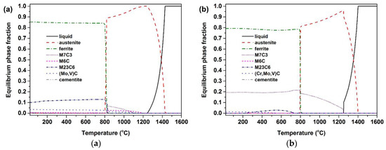 Equilibrium phase fractions calculated by using MatCalc (ver. 5.62) for the two steels: (a) Cr6C9 and (b) STD11.