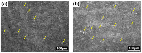 Optical micrographs of the tempered specimens: (a) Cr6C9 and (b) STD11. The arrows indicate the primary carbide in a bright color.