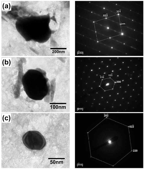 TEM images and the corresponding selected area electron diffraction (SAED) patterns for (a) M7C3 precipitate; (b) M6C precipitate; and (c) (Mo,V)C precipitate.