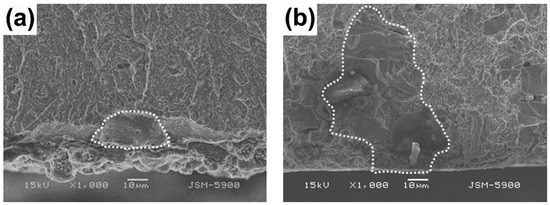 Figure 6 shows the SEM image of the fracture surface of the Charpy impact testing specimen. The fine carbide was observed at the fracture surface in the Cr6C9 specimen whereas the coarse carbide was observed at the fracture surface in the STD11 specimen. It is reported that the crack can easily initiate and propagate near coarse carbide, resulting in fracture, as the stress is applied [18,19]. Hence, the lower impact toughness value was caused by the coarse carbide in the tempered STD11 specimen.