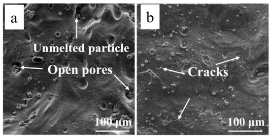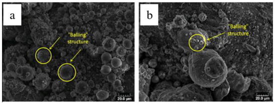 Figure 14 shows the occurrence of balling phenomenon observed during SLM processing of Mg-9%Al powders [60], wherein a large amount of micrometer-scaled (diameter of 10–20 µm) spherical splashes, formed around the sintered surface, can be seen. When relatively higher scanning speeds were applied, laser energy density of the laser input decreased causing a significant shrinkage in inter particle areas, leading to capillary instability of the molten pool. Therefore, due to the reduction in surface energy of the liquid at short length scales, small sized liquid droplets splashed from the liquid surface. Further, balling obstructed the formation of continuous melt lines, forming rough and bead-shaped surfaces. In more severe cases, balling may aggravate in subsequent layers and jam the powder coating mechanism with large metallic beads that extend above the powder bed. The balling effect can be avoided if the stability of the melt pool is improved by reducing the length/width ratio of melt pool and/or increasing contact width, which can be achieved by increasing the laser power or decreasing the scanning speed [111]. According to Li et al. [112], lowering the oxygen level during the process and introducing repeat exposure of laser to break up the oxide films are ways to minimize the occurrence of balling, as balling behaviour during the SLM process is related to the oxidation of metals [112]. In their study regarding SLM processing of Ni and stainless steel powders, it was observed that balling could be reduced significantly by keeping the oxygen level at 0.1%, and by applying a combination high laser power and low scanning speed or applying re-scanning of laser [112]. However, even though the oxygen content in the chamber was kept below 0.2%, Hu et al. [59] observed the occurrence of balling during SLM processing of magnesium, as magnesium being very active is susceptible to oxidation.