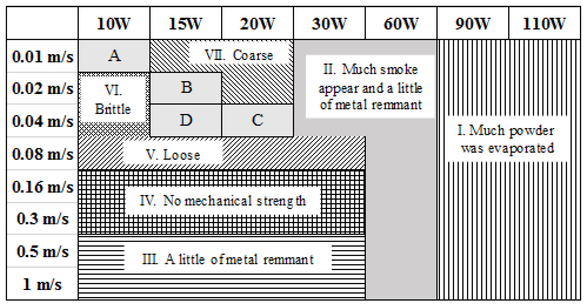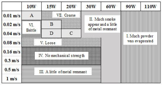 The above equations ((1) and (2)) present the energy density that is available to heat up and melt the powders for fabricating single (J/mm2) and multiple layers (J/mm3), respectively. The occurrence of various regions in the processing window as well as the resulting microstructure is dependent on the laser energy density, rather than laser power or scanning rate in isolation. Based on the formation quality of the specimens during the SLM process, four regions of behaviour could be defined over the considered range of the laser power and the scanning speed for different magnesium and magnesium alloy powders: