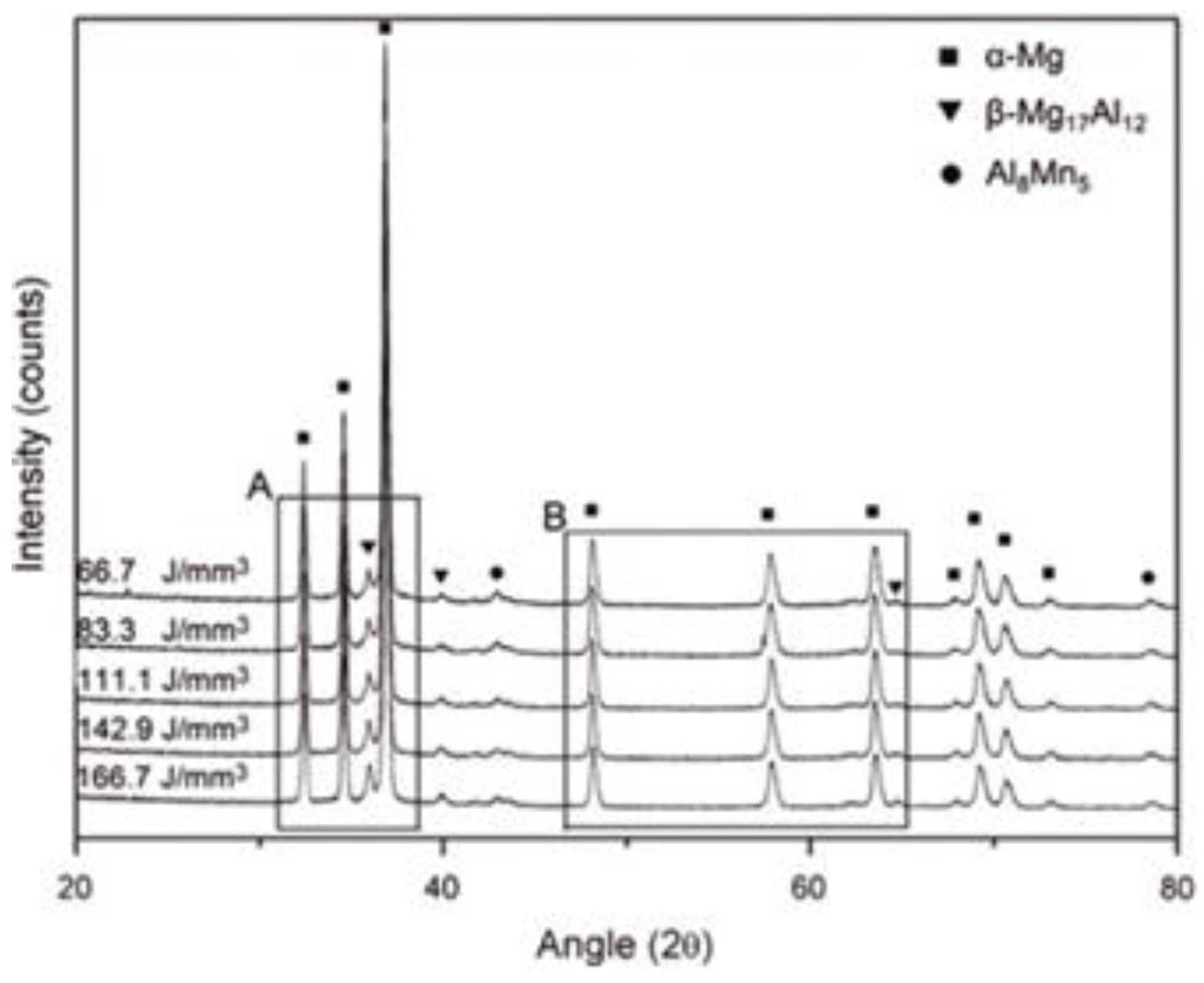 X-ray diffraction (XRD) patterns of the SLMed AZ91D samples fabricated at different laser energy densities indicating absence of any surface oxide films [61].