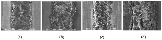 Layer thickness is another important parameter that has a significant impact on the porosity and layer bonding in the fabricated parts affecting the tensile strength, hardness and dimensional accuracies in the direction of the build [83]. For instance, a higher powder layer thickness will result in less fusion between the particles because the same amount of energy has to be radiated to a greater amount of material as compared to a lower layer thickness. Consequently, less dense parts with more pores and voids will be formed as the laser energy density penetrating the powder bed will be insufficient to completely melt the powder particles. Therefore, an optimum layer thickness must be established to achieve finer resolution and allow for good connectivity between the powder layers with lesser degree of spheroidisation leading to formation of denser parts. Minimum layer thickness can help in improving the quality of the metallurgical bond between successive layers as it helps increasing the penetration depth of the molten pools resulting in multiple remelting of the previously deposited layer and improving the wetting characteristics [61]. Layer thickness also has a close inverse relationship with the total processing time and determines the amount of energy required to melt a layer of powder. The effect of layer thickness on the dimensional and mechanical features of the fabricated tracks from magnesium powder, such as melting depth, melting width, oxidation, elastic modulus, and nanohardness was studied by Savalani et al. [58]. In their study, pulsed mode Nd:YAG laser with a wavelength of 1.06 µm, spot size of 270 µm, pulse duration of 20 ns and a maximum power of 30 W was used to process the magnesium powder. Scanning speeds were adjusted between 10 and 200 mm/s while the layer thickness varied from 150 to 300 µm. The results demonstrated that there exists a critical value of layer thickness beyond which successful remelting of the previously processed layers was not possible leading to formation of irregular and disrupted surfaces, which was 250 µm in that study. Flatter surfaces without any surface defects were obtained at a lower layer thickness values of 150–250 µm as seen in Figure 5. Also, no heat affected zone was observed at lower layer thickness values. Since the amount of material to be melted is significantly less, heat conducted in the molten pool has sufficient energy to completely melt the neighbouring particles as opposed to being partially melted. However, lowering the layer thickness below minimal permissible level for a powder system can create problems in spreading homogenous layers of fresh powder [84]. In general, densification is improved with the increase in laser power and decrease in the scan speed, layer thickness and hatch spacing. Similar trends in the densification behaviour is also found to be true for other materials such as Al-12Si [84], Ni-alloy-Cu and Fe-Cu [85].