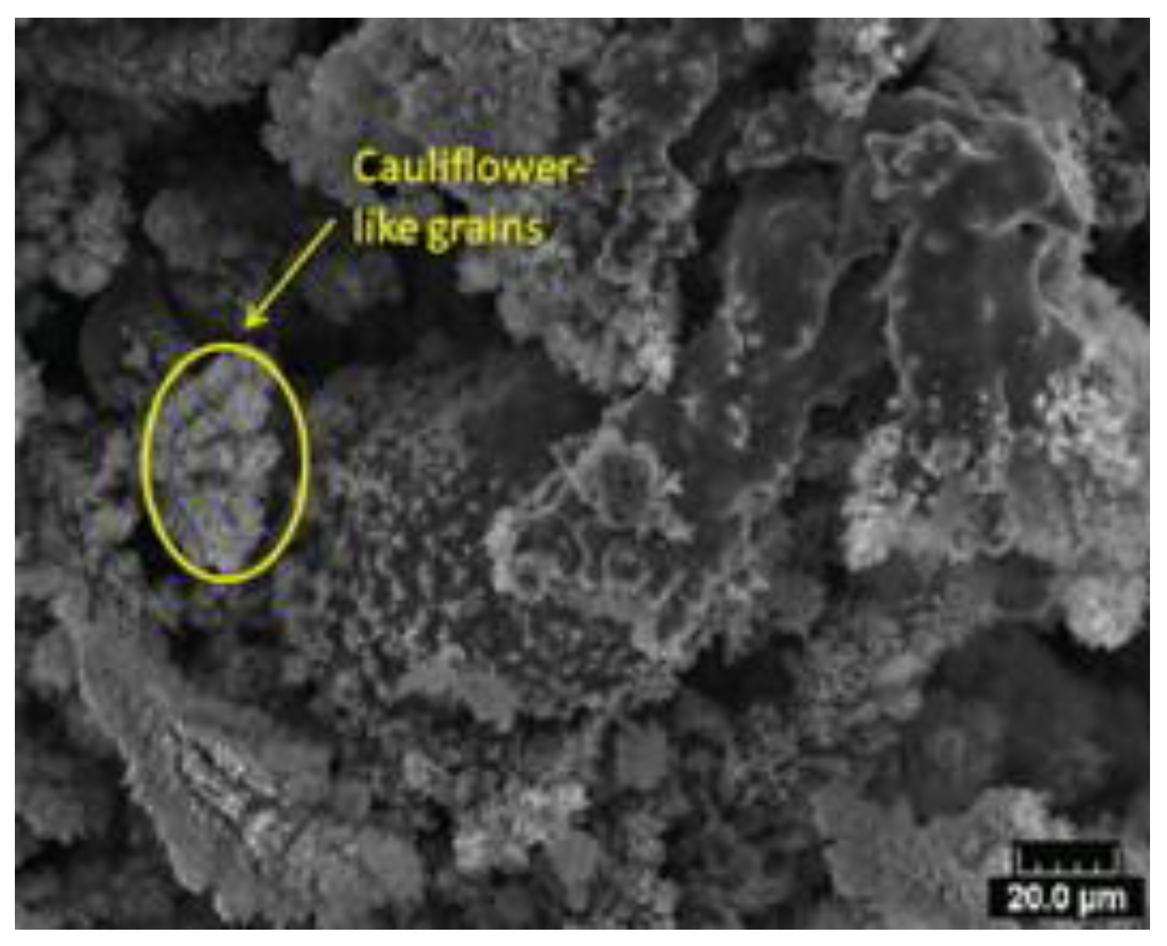 During SLM processing of Mg-9%Al powders, Zhang et al. [60], witnessed formation of cauliflower like grains with interconnected pores on the surface of the metal as shown in Figure 7 caused by a metal evaporation–solidification process. Though the majority of the laser energy was reflected because of low absorptivity of both magnesium and aluminium, adequate amount of Mg-Al powder could be melted and a molten pool was formed even at lower energy densities. Due to differences in the thermal properties, the molten pool would absorb much more laser energy than the surrounding powder layer, leading to increase in the molten pool temperature beyond the boiling point of magnesium (1093 °C). Subsequently, an increase in vapour pressure of magnesium from 0.36 KPa at its melting point to 51 KPa at its boiling point led to faster evaporation of the powders and the surface of the molten pool was covered by the melt vapour. Further, the magnesium vapours solidified and deposited on the surface of the metal causing formation of cauliflower like grains.
