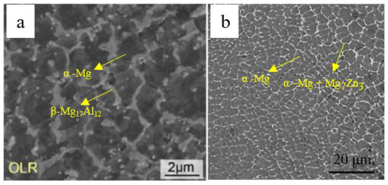 Microstructural features along with resulting properties observed for different SLMed magnesium alloy powders are compiled and tabulated for ease of comparison in Table 6. Conventionally cast magnesium alloys are generally characterized by a coarse microstructure consisting of primary α-Mg and lamellar eutectic (α-Mg + intermetallic) phases with an average grain size in the range of 50–150 µm. However, rapid cooling rates associated along with epitaxial solidification in the SLM process, results in a highly refined microstructure in magnesium alloys with grain sizes of α-Mg matrix in the range of 1–20 µm and often favour the formation of partially or fully divorced eutectic (separation of eutectic phases) homogenously distributed along the grain boundaries of dendritic/columnar primary α-Mg (Figure 8) [49,61]. SLM, being a non-equilibrium process, can extend the solubility of alloying elements in Mg and obtain single-phase Mg alloys with wider composition range [61]. SLM also results in compositional and microstructural changes caused by the combined effects of selective evaporation of elements like Mg and Zn having very high vapour pressures, and consequent enrichment in the relative content of elements like Al and Zr at the surface by “solute capture” phenomenon. In the process of laser rapid melting, very high temperature gradients generated in the melt pool contribute to the formation of a strong Marangoni convection and result in improved homogenous dispersion of alloying elements in the melt pool [62]. Then a subsequent high rate growth of the solid/liquid interface contributes towards “solute capture” phenomenon in α-Mg matrix, resulting in larger amounts of solute atoms to be captured, extending the solid solution limit of alloying elements in α-Mg and retarding the nucleation β-phases [49,61]. Such compositional changes can influence the microstructure, mechanical properties, and corrosion behaviour of laser-melted magnesium alloys.