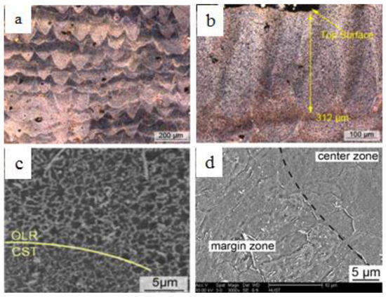 Under an optical microscope with lower magnifications, the SLM formation features are shown clearly. For example, the curve-like regular laser melted tracks on the cross-section correspond to laser scanning strategy, and the laminar material structure and columnar architecture throughout the vertical section are determined by the specimen building strategy, such as the scanning pattern, hatch spacing, and thickness of layers. The cut ends of melted tracks in the form of a series of arcs on the vertical section which are aligned layer by layer, are induced by the Gauss energy distribution of laser as shown in Figure 10a [61]. The penetration depth of the molten pools was observed to be up to 312 µm, which was approximately eight times the layer thickness (40 µm) used in the study for AZ91D alloys (fabricated at a laser energy density of 166.7 J/mm3) indicating that each layer of the as deposited sample undergoes a remelting process more than once. The multiple remelting process plays a significant role in determining the microstructure of SLMed samples as different thermal histories experienced by different layers of the part, led to variation of microstructures along the height direction, as the conduction, convection, and radiation conditions change [61]. The as processed microstructure contains at least two distinct regions: one significantly finer than the other, as shown in Figure 10c,d for AZ91D and ZK60 alloys, respectively. At the edges of the melt pool, the material experiences more cycles of the remelting process caused by both overlapping of the scan lines and creation of subsequent layers to induce relatively lower cooling rates, resulting in localized coarsening of the microstructure. This difference in thermal history between the edges and centre of the melt pool can induce non-uniform distribution of microstructure in the scale of several microns. As can be seen from Figure 10c in the case of AZ91D alloy, the grains on the centre of the scanning tracks (CST) were finer (~1 µm) than those near the overlapping edges (OLR) because of the decreasing cooling rate and multiple remelting cycles experienced at the edges of the melt pool. Also, decreasing the temperature gradient inside the melt pool, can lead to occurrence of columnar-to-equiaxed transition towards the centre of the melt pool. As can be seen from Figure 10d, columnar α-Mg grains dominate the margin zone of the molten pool whereas α-Mg grains in the centre zone of the molten pool presented an equiaxed morphology in the case of ZK60 alloys.
