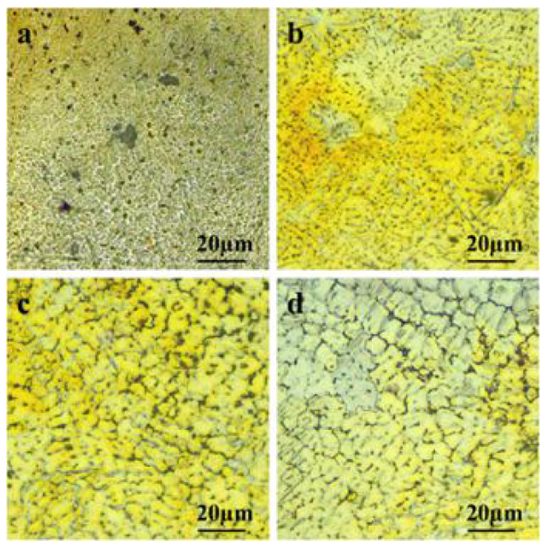 Optical images showing characteristic crystalline structures of laser melted ZK60 prepared at different laser energy densities: (a) 420 J/mm3; (b) 500 J/mm3; (c) 600 J/mm3; (d) 750 J/mm3 [49].