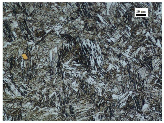 The metallographic studies were performed using a light microscope (Nikon Corporation, Tokyo, Japan). The microstructure in the as-received condition of the investigated steel is presented in Figure 1. The tested material in the as-received state showed a structure of low-carbon martensite. The martensitic microstructure exhibits a high homogeneity and some features that can be described as being similar to tempered martensite, with precipitates of some non-metallic inclusions like titanium nitrides.