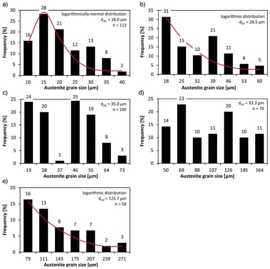 The frequency of occurrence of austenite grain size of the tested steel: (a) in the as-received state; (b) after austenitizing at 900 °C, 20 min; (c) after austenitizing at 1000 °C, 20 min; (d) after austenitizing at 1100 °C, 20 min; (e) 1200 °C, 20 min.